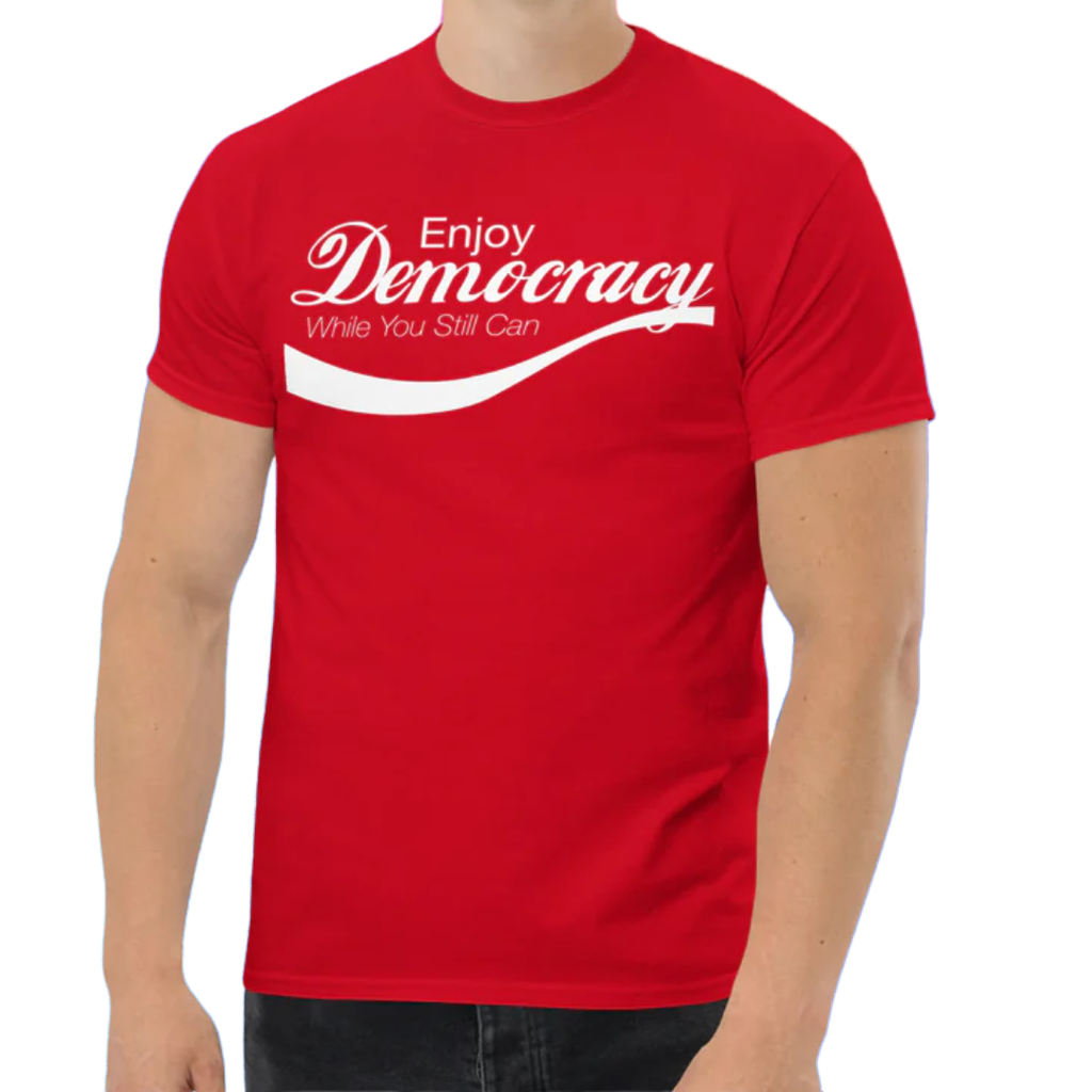 Designed in a bold riff on that classic soda font, this tee looks familiar—until you actually read it. Soft, comfortable, and darkly funny, it’s a wearable warning label for a country slipping into something less refreshing. Perfect for protests, civics class, or just sipping something stronger while you watch the news.